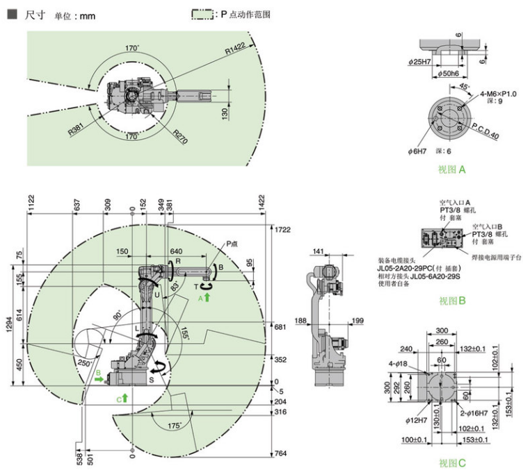 安川MOTOMAN-MH6為6軸機(jī)器人,放置方式既可以地裝也可以壁掛和吊裝。
